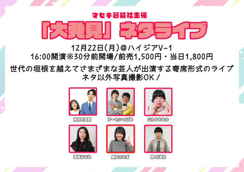 マセキ芸人(と他社ゲスト芸人さん)によるネタライブ。2025年最後の大発見です。