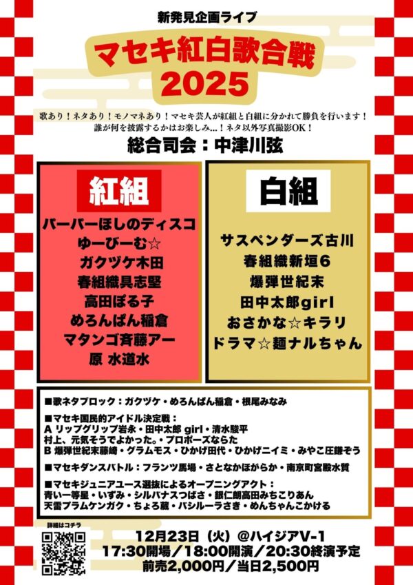 毎年恒例マセキ芸人による紅白歌合戦。歌ネタあり、モノマネあり、ダンスバトルあり!